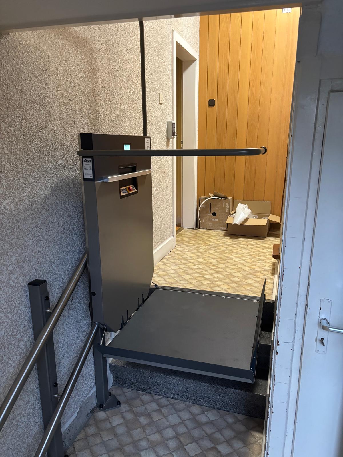 Plattformlift GTL E an der Treppe zum Jugendtreff Geisweid. Ango Bulli steht neben der Treppe.